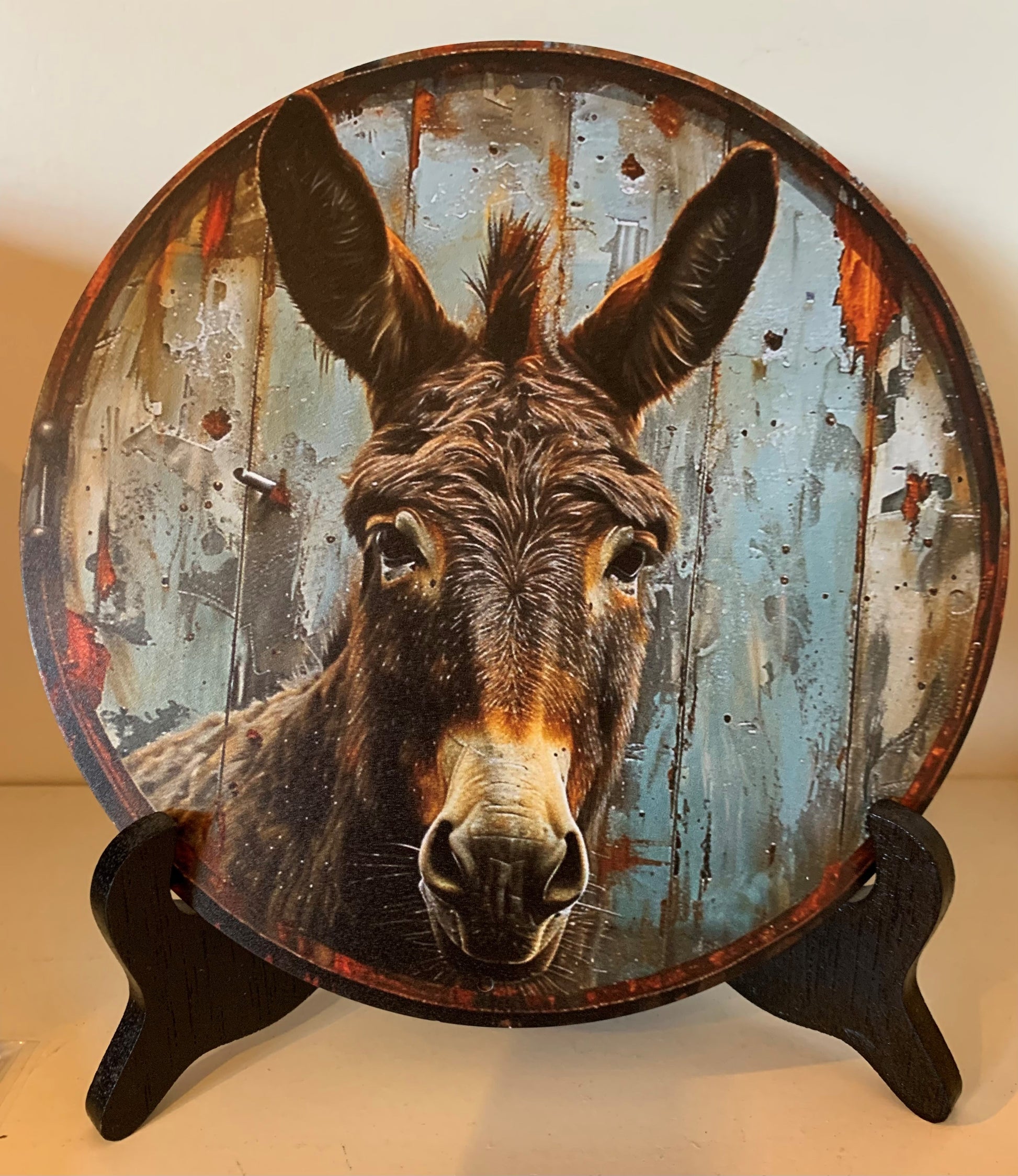 Round aluminum sign featuring a donkey face. Two pre-drilled holes for mounting. 8" across.