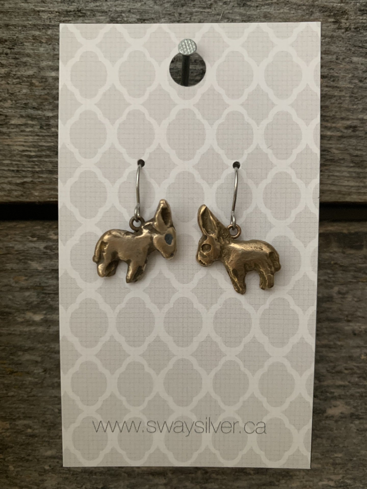 Hand cast bronze donkey earrings made by Sway Silver, with stainless steel hooks.