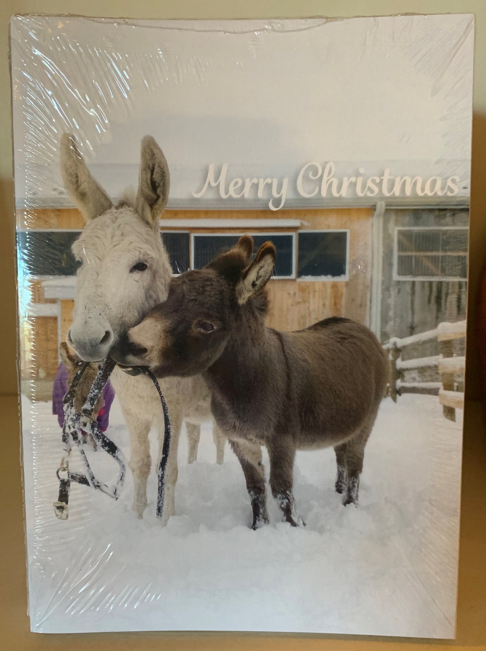 Pack of 12 Christmas cards featuring our donkeys and mules. 4 designs are included, 3 of each design. Blank inside except for the names of the donkeys/mules featured on the front. Includes 12 white envelopes. Limited quantity available.