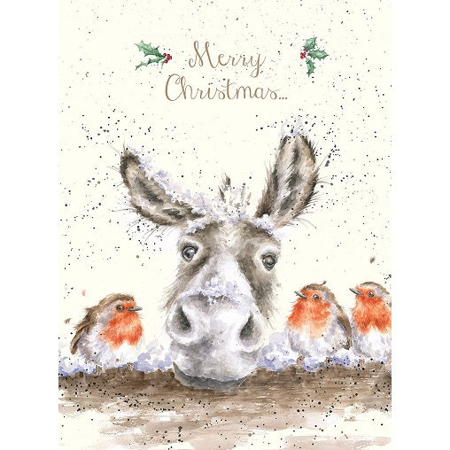 The Christmas Donkey and his feathered friends enjoying a winter day! The beautiful card is printed on high quality textured board. The greeting inside reads ..."and a Happy New Year", and it comes with a recycled kraft envelope. Measures 7"x5".