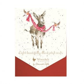Keep a supply of Christmas cards on hand with this lovely set featuring a beautiful donkey wearing a festive scarf. Presented in a wallet, these cards are made from high quality textured board. Each set contains eight cards of the same design with kraft envelopes. Inside card reads "with best wishes for Christmas and the New Year". Measures 6.5"x4.5".